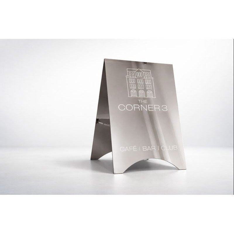 Im Gegensatz zu klassischen Werbeaufstellern setzt dieser Edelstahl-Kundenstopper nicht auf austauschbare Plakate oder auffällige Farben, sondern auf eine klare Formensprache und hochwertige Materialität.